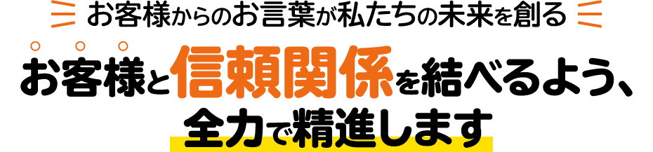 お客様からのお言葉が、私たちの未来を創ると考えています。お客様からのお言葉をしっかりと受け止め、お客様と信頼関係を結べるよう全力で精進させていただきます。